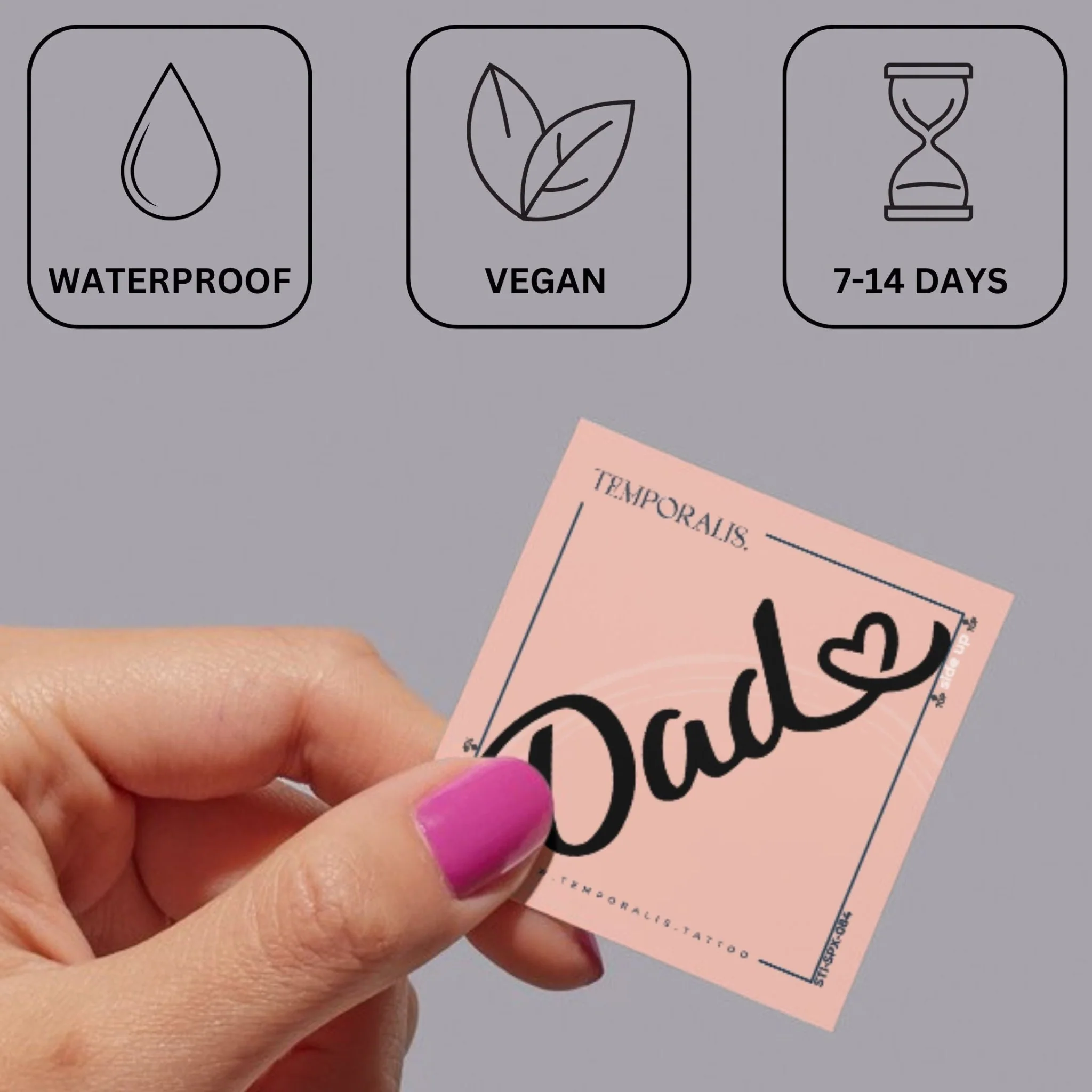 Suitable for those honoring a father figure or exploring family tribute designs with a modern, understated aesthetic. Browse our full range of text-based temporary tattoos for more script options.